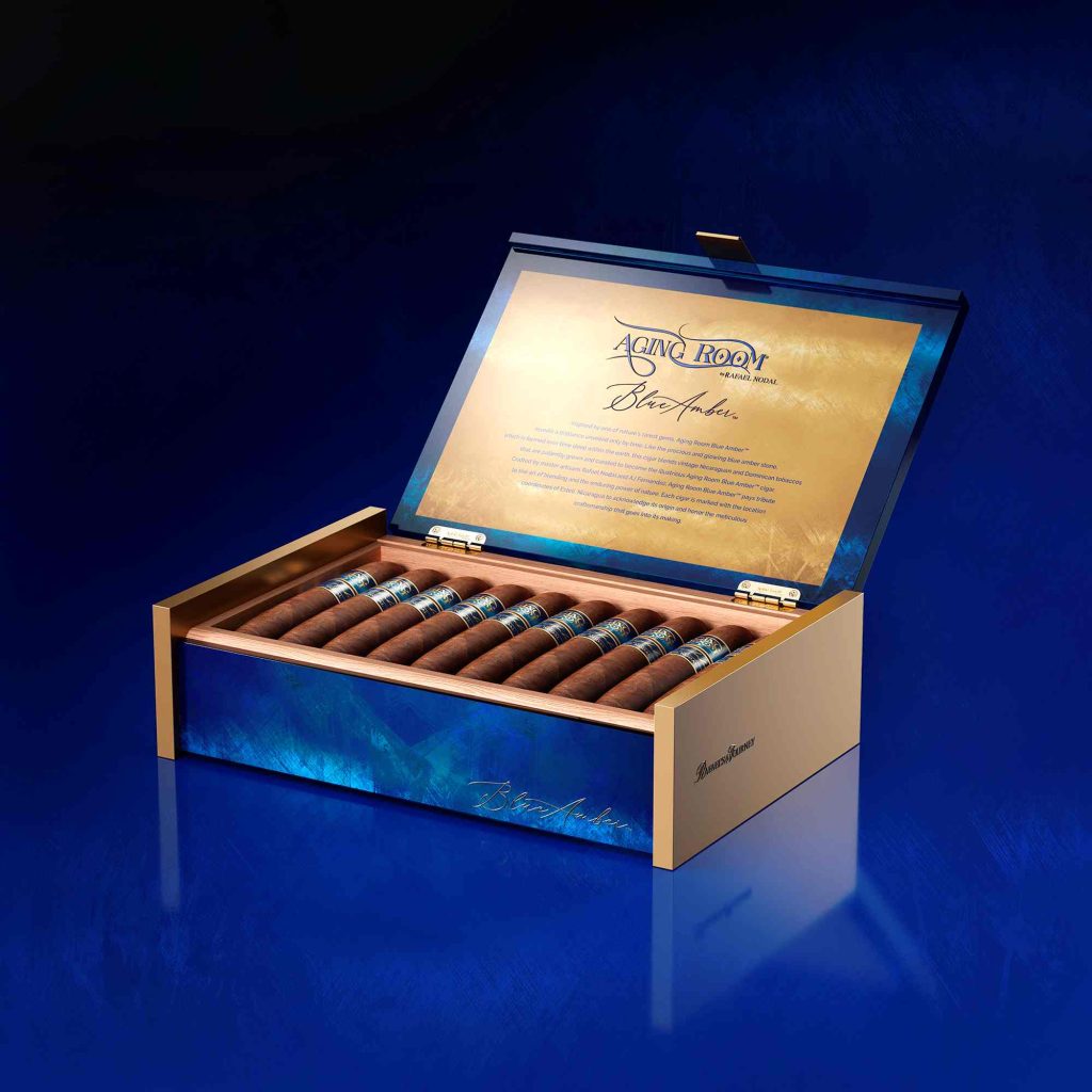 Aging Room Blue Amber features a Nicaraguan wrapper from AJ Fernandez over a select Dominican binder, with Nicaraguan and special Dominican fillers sourced from the amber-rich La Cumbre region, delivering a medium-to-full-bodied experience with layered flavors, refined complexity and a smooth, satisfying finish.