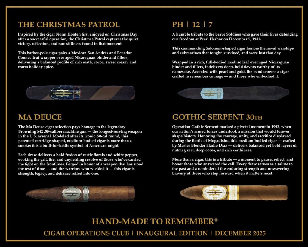The Cigar Operations Club, which goes live on November 28 – Black Friday, delivers a curated selection of premium cigars every two months, featuring club-exclusive small-batch releases, limited editions, and specialty blends crafted solely for members. With three tiers of membership — Recruit, Officer, and Commander — the program offers a structured and intentional journey for cigar lovers at every level.